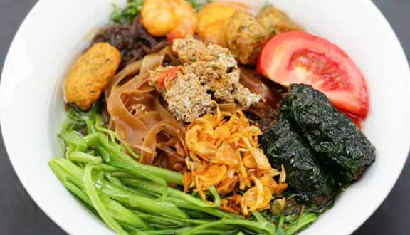 Quán bà cụ có 2 lựa chọn chính là bánh đa trộn và nước. Bánh đa đỏ đặc trưng của thành phố cảng sau khi được chần qua nước sôi, thì bày biện cùng rau, các loại hải sản, chả và chan nước dùng. Nếu ăn trộn bạn sẽ có bát nước dùng ăn kèm bên ngoài.